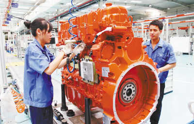 位于安徽芜湖三山经济开发区的玉柴联合动力股份有限公司,工人在装试车间“6K13N天然气发动机”流水线上工作,这是目前国内最大功率的纯天然气发动机。