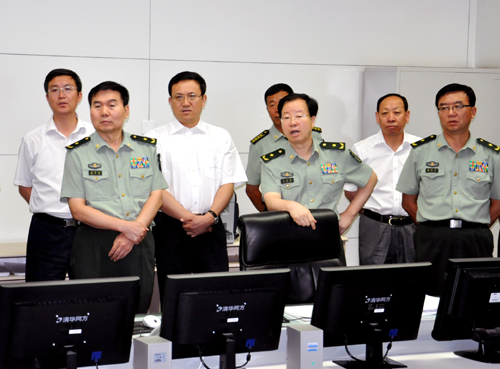 宁夏军区司令员昌业廷(左二)、政委王志宏(右三)在神宁集团董事长王俭(左三)、党委书记陆维平(右二)、总经理严永胜(左一)的陪同下参观神宁集团安全生产调度中心。