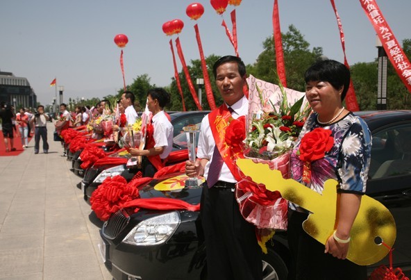 “十佳班组长”与妻子在奖励的轿车前合影留念。 记者 高 珊 摄