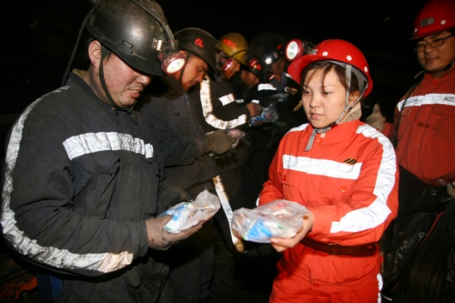 在开展“百日安全生产无事故”活动期间,红柳矿充分发挥女工及员工家属在安全生产工作中的作用,积极组织女工及家属深入开展“送温暖、保会战”、“安全文艺进区队”、“安全有奖知识问答”等一系列安全活动,为井下一线员工送去了安全毛巾、火腿肠、鸡腿等慰问品,叮嘱员工们在工作中一定按章作业,确保安全生产。广大员工纷纷表示一定牢记安全,做到不违章、不蛮干,为实现全矿“百日安全生产无事故活动”目标做出贡献。图为5月23日,该矿工会组织女工家属深入1121综采工作面慰问一线员工。