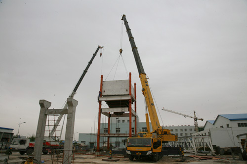 5月17日,梅花井矿重达35吨的自制钢铁煤矸石仓起吊到位。这是宁东能源基地目前在建项目中最大的一座钢铁煤矸石仓。图为起吊现场。