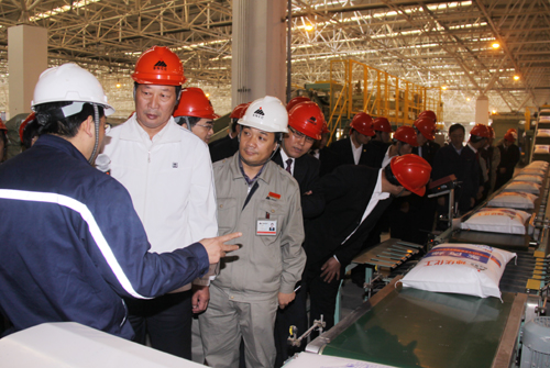 图为陈毅(左二)与劳模一同观看聚丙烯分装流水生产线。