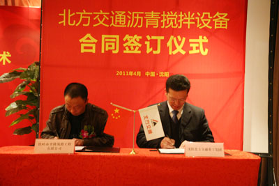 2011年4月9日,由沈阳北方交通重工集团主办的“2011年春季北方交通沥青混合料搅拌设备新技术交流与应用暨重点客户见面恳谈会”在沈阳隆重召开。大会特邀了行业领导及权威专家参会,并作专题学术报告,共同交流、探讨沥青混合料搅拌设备技术与经验。会议同期,北方交通分别与铁岭市奕隆筑路工程有限公司、黑河市弘发房地产开发有限公司、内蒙古哈达建设集团有限公司及加格达奇市政建设工程有限公司举行沥青搅拌设备合同签订仪式,分别签订了多台KFM.LB4000型、KFM.LB2000型、KFM.LB1500型沥青搅拌设备的购机合同。