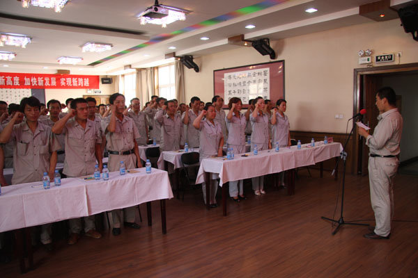 (通讯员田冬林 李红)神宁集团白芨沟煤矿始终坚持青年安全监督岗员的政治思想和业务技能教育,每季组织召开全矿青岗员例会,了解岗员思想动态,总结工作经验,还不定期组织各分岗岗员交流学习互访。图为该矿举办岗员培训班上岗员集体宣誓。