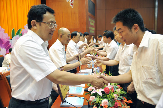 图为神华宁夏煤业集团公司董事长王俭(左)为受表彰人员颁奖。