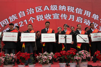 4月1日,自治区“A级纳税信用单位表彰授牌暨第21个税收宣传月”活动启动仪式在光明广场举行,自治区领导齐同生、何学清、解孟林出席启动仪式并为29个连续3次获得自治区A级纳税信用单位授牌。居光华副行长代表我行上台领奖。