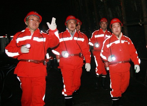 图为袁家军(左二)在王俭(左一)的陪同下到红柳矿1122综采工作面参观,对矿井基础建设、设备运行情况进行现场调研。