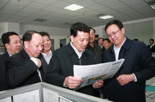 图为袁家军(前排右二)在王俭(右一)、陆维平(左二)等陪同下到新闻中心参观,详细询问了报纸的出版、印刷、发行情况,对新闻中心多种媒体联动模式给予高度评价。