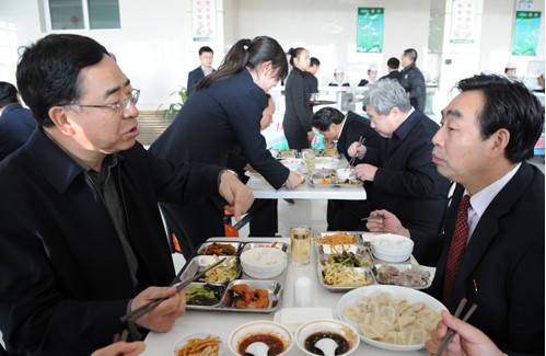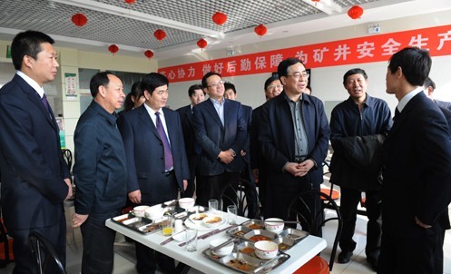 座谈会后, 张毅一行来到石槽村矿员工食堂察看了就餐环境、饭菜质量,并与员工亲切交谈、共进午餐。
