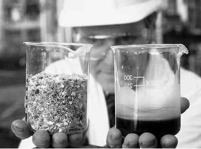 工程师一手持有粉碎后的塑料,一手拿着提炼出来的油脂。