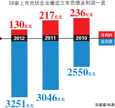 在债务激增的同时,光伏上市企业利润率却在步步下滑。统计显示,这58家上市公司去年的净利润总计为130亿元。而2011年和2010年则分别为217亿元和236亿元,不难看出净利润有明显的下滑趋势。