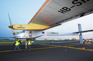 安德烈·勃希伯格驾驶太阳能飞机降落后说,这是历史性时刻,降落过程令人难忘,当时已是夜晚,太阳能飞机利用自身少量电能将跑道照得亮如白昼。