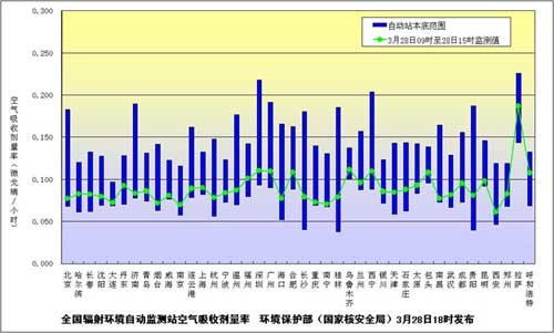 环境保护部(国家核安全局)3月28日18时继续发布全国省会城市和部分地级市辐射环境自动监测站实时连续空气吸收剂量率监测值。监测结果表明,目前中国环境辐射水平仍在本底范围内,日本核电事故未对中国环境及境内公众健康产生影响。