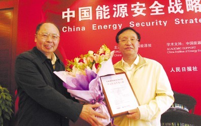 图为人民日报社社长张研农(左一)为张国宝同志颁发“2010中国能源年度人物”奖。
